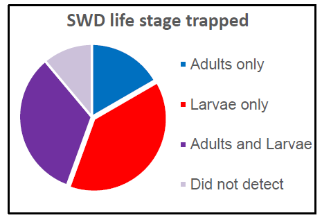 SWD Monitoring: 80% of respondents monitored for SWD in 2015. Of those who monitored, only two (12%) did not catch any SWD. Three (18%) trapped adults only, seven (41%) trapped larvae only, and six (35%) trapped both adults and larvae.