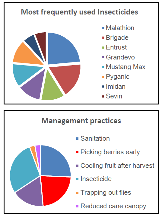 Other management practices used include sanitation (picking off damaged and/or fallen berries; 64% of respondents), picking berries early (57%), and cooling fruit after harvest (47%). Only one grower (7%) used trapping out flies as a management technique, one (7%) used reduced cane canopy, and no growers used screen exclusion or floating row cover.