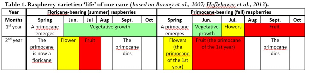 In the summer-bearing raspberries, the canes of the first year (called primocanes) show up early in spring and have only vegetative growth during the first year. On the second year, primocanes (now called floricanes) have flowers and then fruit early in the summer season. In the fall-bearing raspberries, however, primocanes have fruit during the first fall season. On the second year, primocanes continue to have fruit usually until mid-summer, and then they die (Fig. 1 and Table 1).