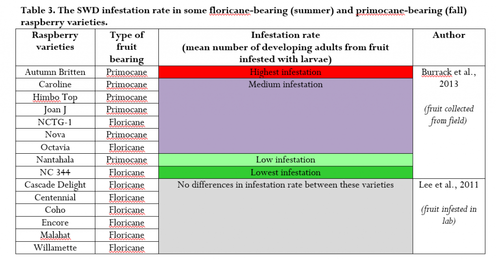 Even though all raspberries might be susceptible to SWD, different varieties of summer raspberries and fall raspberries still can have different infestation rate. For example, Burrack et al. (2013) compared the SWD larvae infestation rates in the field across different commonly grown raspberry varieties in the southeastern US. They found that although none of the varieties escaped infestation, some varieties such as floricane-bearing ‘var. NC 344’ and primocane-bearing ‘Nantahala’ had lower infestation rates (Table 3). At the same time, some summer (floricane-bearing) raspberry varieties might not differ in the SWD infestation (Lee et al., 2011; Table 3).