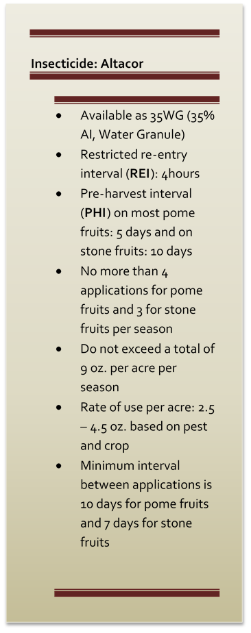 Altacor is registered for use in Wisconsin on pome fruits, including apple, crabapple, pear, and quince as well as stone fruits, including apricot, sweet and tart cherry, nectarine, peach, and plum. It was first registered around 2008 so you may have some experience with it. It is marketed by Dupont® under the formulation 35WG (35% of active ingredient as Water dispersible Granules). Altacor is in the class of the anthranilic diamides with a different mode of action acting on the insect ryanodine receptors in the muscles, causing an uncontrolled release of calcium in the cells. Altacor contains the active ingredient Rynaxypyr also known as chlorantraniliprole. Altacor is most effective through ingestion of treated plants but also has contact activity. Affected insects will rapidly stop feeding, become paralyzed and eventually die within 1-3 days. Applications should be timed to the most susceptible insect stage, typically egg hatch and/or newly hatched larvae. Apply at or before egg deposition for best results.