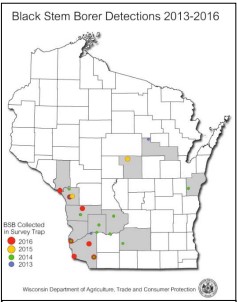 In Wisconsin, black stem borer has not yet been found in an agricultural crop, but only in lumberyards and wood waste disposal sites. However, to be on the safe side, it would be good to learn to recognize this beetle and their damage symptoms, and to make sure you get in contact with one of us, or your local extension agent, if you suspect damage from the black stem borer in your fruit trees.