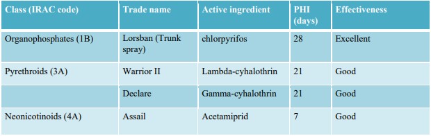 Monitoring for flat-headed apple borer includes being on the lookout for wilting or unhealthy trees, then looking for areas of depressed and discolored bark and oozing sap. Cultural controls include being sure to promptly remove wrapping from the trunk of the trees after one season, and keeping the trees well-watered and healthy, as these both decrease the attractiveness of the tree to flat-headed apple borer. Additionally, if a problem does arise in your orchard, you can use trap logs, by lying freshly cut logs of any species, covered in a sticky substance, in the orchard. This will trap and kill ovipositing females. If damage is not yet extensive on an apple tree, it may be possible to save the tree by cutting away the damaged bark and finding and killing the larva. Chemical control options are listed in the table below. Other product recommendations can be found in the latest Midwest Fruit Pest Management Guide. As always, read and follow the label before spraying any pesticide.