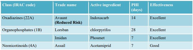 Monitoring can be done using pheromone-baited traps at approximately head-height in the trees. Cultural control can include painting a white latex on the trunk of the tree, which discourages dogwood borer females from ovipositing. Additionally, it will help to be aware of which rootstocks are most likely to cause burr knots. Whether using a susceptible rootstock or not, allowing sunlight and air-circulation on the graft union can help minimize the risk of burr knot development. Mating Disruption (Isomate®) is not currently registered for use in Wisconsin. However, Isomate® has been shown in other states to be an effective product, which, unlike traditional mating disruption pheromones, is a repellant to males seeking out females, pushing them out of the orchard. Should the need arise, we will make an effort to get a mating disruption product registered for your use against dogwood borer. Chemical control options are detailed in the table below. There are many other tradenames available, and we do not recommend these that are listed above other options. All product recommendations can be found in the latest Midwest Fruit Pest Management Guide. You should always fully read and follow the label before spraying any pesticide.