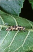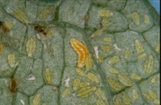 Ladybeetles (order Coleoptera, family Coccinellidae) are very important biological control agents against soft-bodied insect pests, such as aphids. Being predacious throughout their life, each ladybeetle larva consumes hundreds to thousands of pests during its development, and their ability to increase population size rapidly to keep up with pest outbreaks makes them very good natural enemies. Ladybeetle larvae are alligator-shaped and very mobile (see photo to the left). The eggs are bright yellow clumps of ovular eggs, usually laid on the underside of leaves.