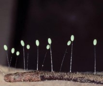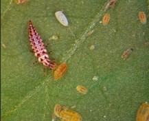 Lacewing larvae (order Neuroptera) are voracious predators that feed mainly on aphids, but also on scale insects, leafhoppers, mites, caterpillar eggs and pear psylla. The larvae are also alligator-shaped and feed using their hollow sickle-shaped mandibles, which they pinch into their prey and suck out their innards (see at photo). Lacewing eggs are easy to recognize as each egg is laid on a threadlike stem, raising it up in the air to prevent early-hatching voracious larvae from feeding on their siblings! Each lacewing larva can eat up to 600 aphids during its development. Because lacewing larvae are active earlier in the season than many other predators, they are often used against early-season pests. Their eggs can be purchased for augmentation biocontrol, or the mobile adults can be encouraged to lay eggs on your property by providing them with floral nectar resources.