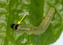 Description and Life Cycle: OBLR has two generations per season in Wisconsin, with caterpillars present and feeding in orchards in early spring, again in mid-summer, and a final hatch of caterpillars in the fall (which will overwinter and continue to feed the following spring). OBLR caterpillars can be distinguished from other fruit tree leaf rollers by the light green body combined with the brown/black coloring on both the head capsule and the prothoracic shield (the body segment behind the head capsule; yellow arrow). The fall caterpillars we will see soon will feed on foliage and fruit for a while, before overwintering as second or third instar larvae inside a protective structure called a hibernaculum in the bark or other protected areas in the tree canopy.