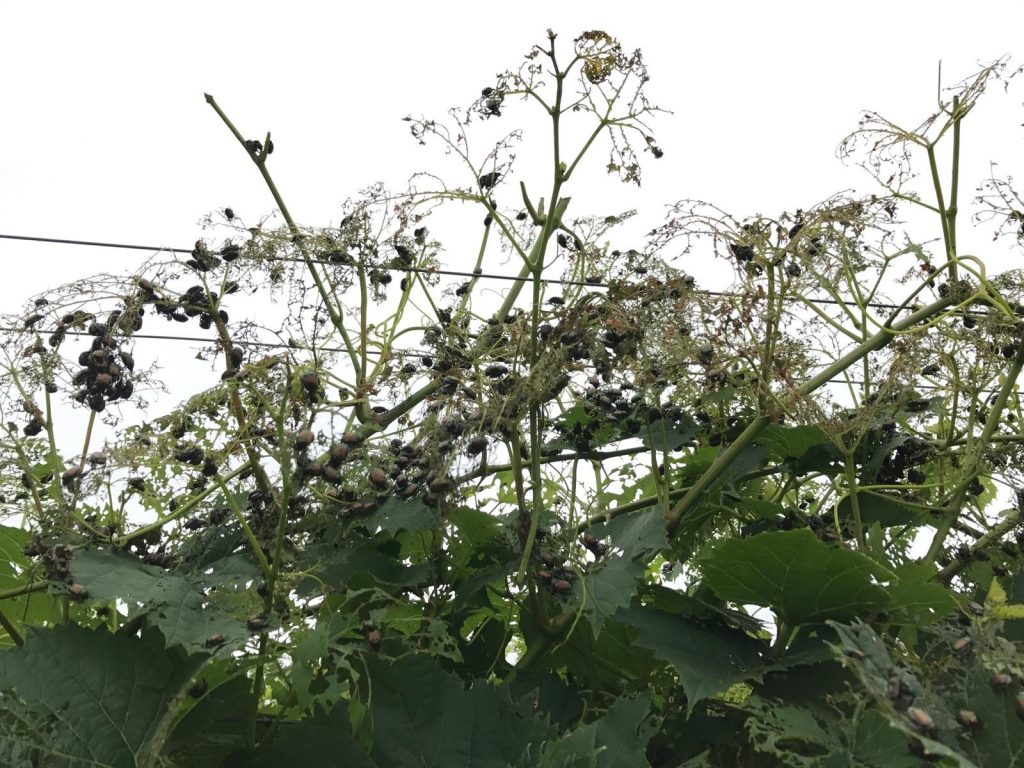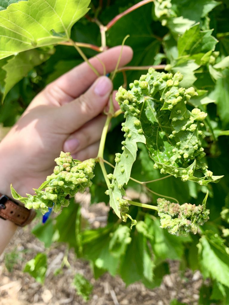 This week, the scouting at the West Madison Research Station (WMARS) vineyard occurred on 7/15/19. Grape phylloxera galls continue to be observed on most cultivars with leaves starting to fold over in many cultivars, including Brianna, Frontenac, Itasca, Petite Pearl, and Crimson Pearl (Figure 1).