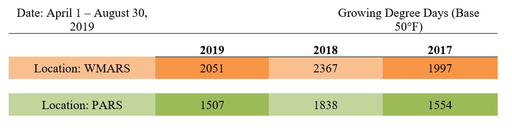 Growing degree-day accumulation from April 1 to August 30 for the past three seasons. Currently, the 2019 season is running behind in GDD accumulation compared to 2017 and 2018 seasons. Degree-days were calculated using a base 50°F, starting on April 1 as a biofix. We calculated degree days using the NEWA website, and you can visit their “About degree days” page to learn more about the degree days and the formulas used for their respective calculations (http://newa.cornell.edu/index.php?page=about-degree-days).