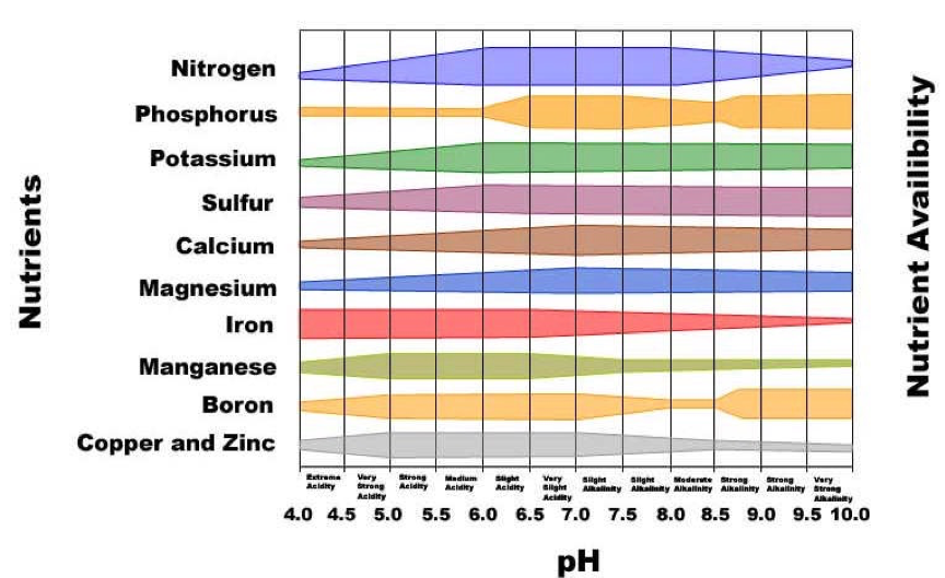 Why does it matter? The soil pH directly affects how chemicals (including fertilizers and nutrients released from organic matter) will react in the soil. Each nutrient has a pH range in which it is most available for plants to take up, therefore, as the pH of a soil changes, the availability of nutrients changes. The ideal pH for cranberries is 4.2-5.5, which is quite acidic com- pared to other crops. If the soil is higher than 5.5, the availability of nutrients dramatically changes. Calcium, magnesium and potassium become much more available and can become ‘toxic’ by creating nutrient imbalances in the soil (Figure 1).