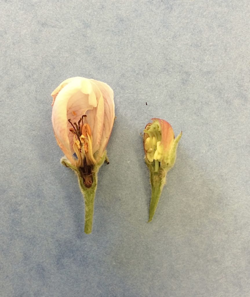 After the freeze event you should collect blossoms to assess the extend of the damage. It will take between 12 to 24 hours for the damage (browning of flowers structure) to express, so if you go sample flowers the morning after the freeze you will not see much, you have to wait 12 to 24 hrs. Choose 15 blossom clusters on 5 trees per block, select the cluster from the top, middle, and bottom of the canopy. Since the king blossom will be the most advanced flower in the cluster, it is most likely to be killed in a frost, so you should check the king and side blooms separately. The pistil of the flower in apples is located at the base of the flower, which means that is necessary to tear the flower apart to see if the center of the flower is brown or black (Figure 1).