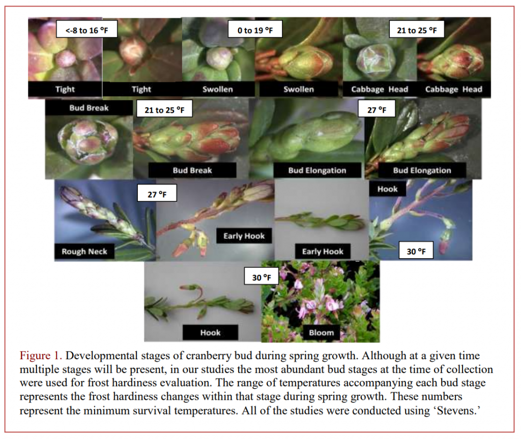 These might or might not be the questions everyone wonders about cranberry frost tolerance as buds break dormancy in the spring, but they had been mine, so maybe they’ll help you as well. I grew up with “The Frost Tolerance Chart” tacked onto the wall, but I was in middle school, so I didn’t read the paper. Talking with growers about frost tolerance heading into this cold weekend encouraged me to take out the paper and connect the dots.