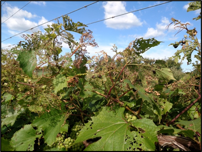 JB adults feed on grape leaves quite extensively and, for the most part, only cause cosmetic damage (Fig. 3). Grape plants are known to tolerate quite a bit of defoliation, as we all know from all the thinning you have to do each year, and research from Michigan State University suggests that 30% defoliation could be used as a threshold for implementing an insecticide application. Chemical products for JB adults control include organophosphates (e.g., Imidan), carbamates (e.g., Sevin), pyrethroids (e.g., Danitol, Baythroid, Mustang Maxx), and neonicotinoids (e.g., Assail). Organically-approved insecticides include the insect growth regulators and repellents Neemix or Azadirect, the kaolin clay Surround as a repellent, the soil born bacterial insecticide BeetleGone!, and pyrethrum (Pyganic).