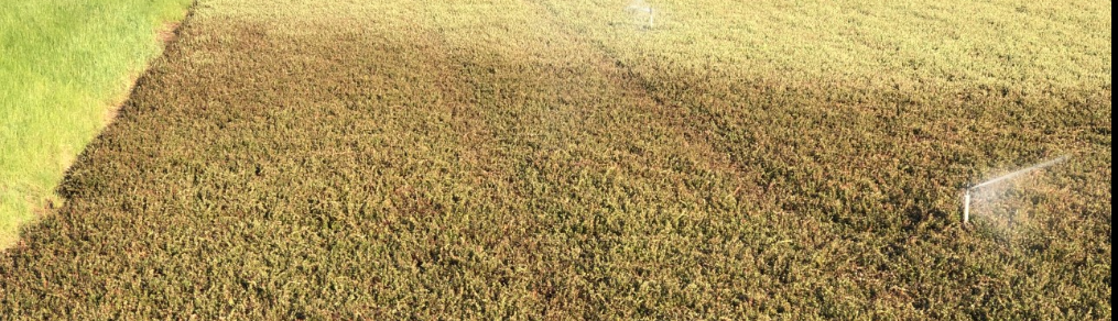 The obvious straight line and location of the damaged patch makes us pretty certain that this isn’t an application issue–checking chemical and fertilizer history confirms that. These Mullica Queens were planted in 2011, and were sanded in 2013, 2014, and 2015—but not since.