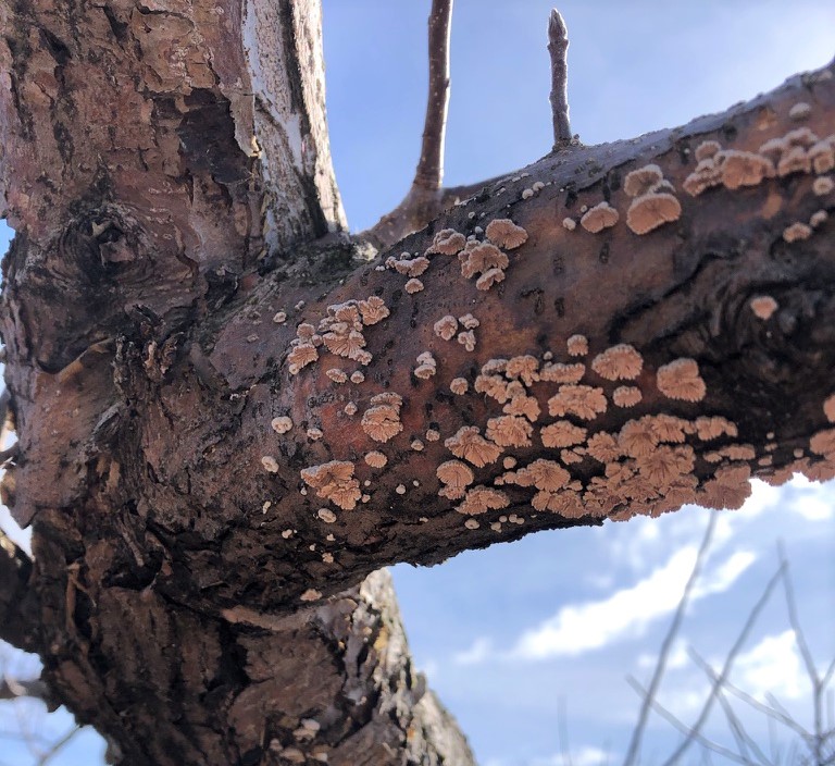 Wood decay fungi are a widespread occurrence in many older orchards. Their appearance may seem concerning, but they are often seen as part of the aging process. However, wood decay fungi in young trees may be a sign of tree stress such as a wounding event that provided an entry point for a wood decay fungus. Wood decay fungi can weaken a tree, contribute to decline in productivity, and ultimately lead to tree death. Many different fungal species cause wood decay, and these fungi can often be found on other tree species near an orchard.