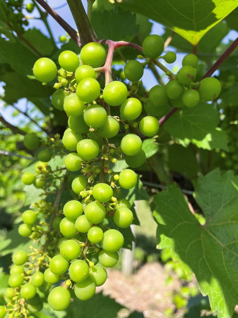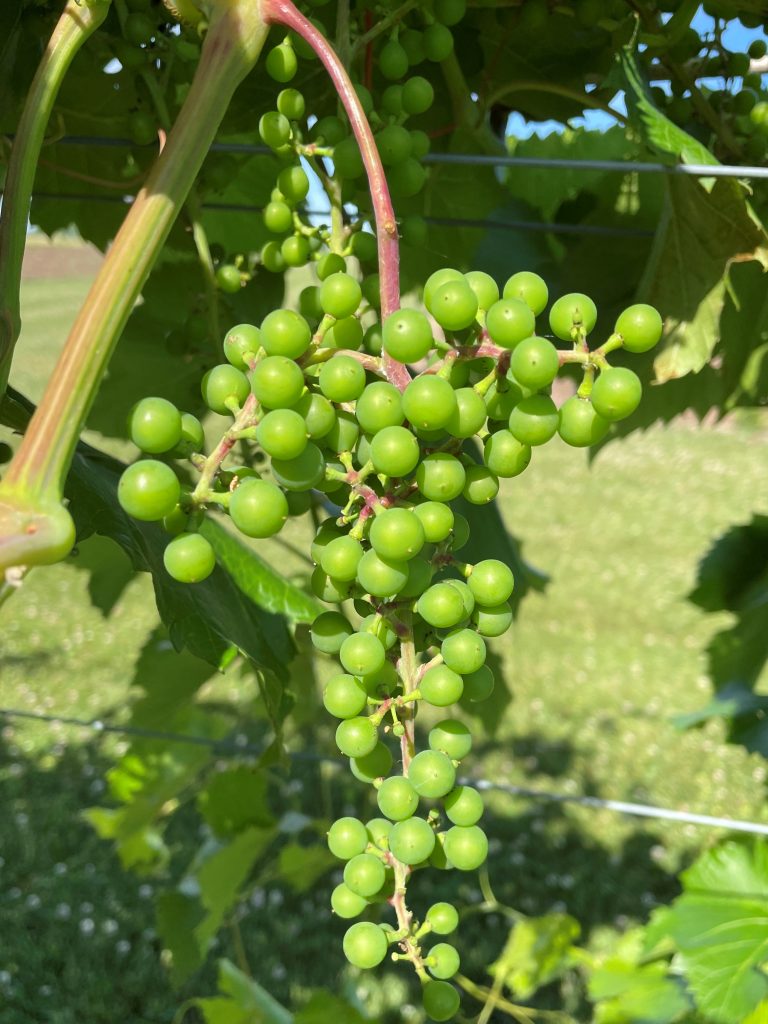 This week at the West Madison Agricultural Research Station (WMARS) in Verona, WI, cultivars are at various stages of setting and developing berries, ranging from E-L* Stage 29 (Berries pepper-corn size (4 mm diam.); bunches tending downwards) to Stage 32 (Beginning of bunch closure, berries touching (if bunches are tight)). The setting of fruit on Marquette clusters was more variable due to uneven pollination. Brianna clusters are typically tight and they are now reaching bunch closure.