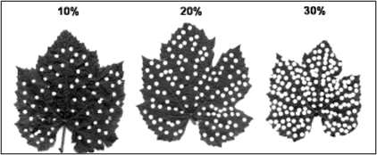 While Japanese beetle are voracious feeders and can aggregate in large number on a single tree, they are unlikely to cause significant damage to apple trees from defoliation alone. UMN research described defoliation to be on average 4% of the total canopy per tree in Honeycrisp and 1% in Zestar!®. Thus, while the damage to a single leaf or a group of leaves may seem alarming, it is important to take the entire tree foliage into account when estimating percent defoliation. While no research has yet linked defoliation by Japanese beetle on apple tree health, growth, or fruit production, it is likely that apple trees can tolerate 20-30% defoliation (Fig. 2) without any significant impact on tree health. It is unlikely that apple trees in Wisconsin will experience such levels of defoliation, but in the event that an outbreak of Japanese beetle was observed, young trees, preferred cultivars such as Honeycrisp, Lodi, and Pristine, and high density orchards with small leaf canopies should be monitored. In the event that an insecticide should be applied, refer to the Midwest Fruit Pest Management Guide for chemical recommendations.