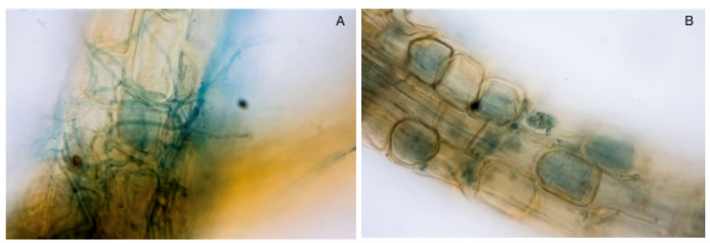 The mycorrhizae connect to one another through long, branching filaments called fungal hyphae (shown in Fig. 2a). ErMF hyphae form the mycorrhizae by inserting themselves into the fine root cells, developing a tightly packed hyphal “coil” inside the cell, resulting in root volumes that are up to 80 percent fungal [7]. Examples of these hyphal coils can be seen stained blue in Figure 2b. The hyphae form a loose network around the root system and have an extremely high surface area, which is what facilitates uptake of otherwise unavailable nutrients [3].
