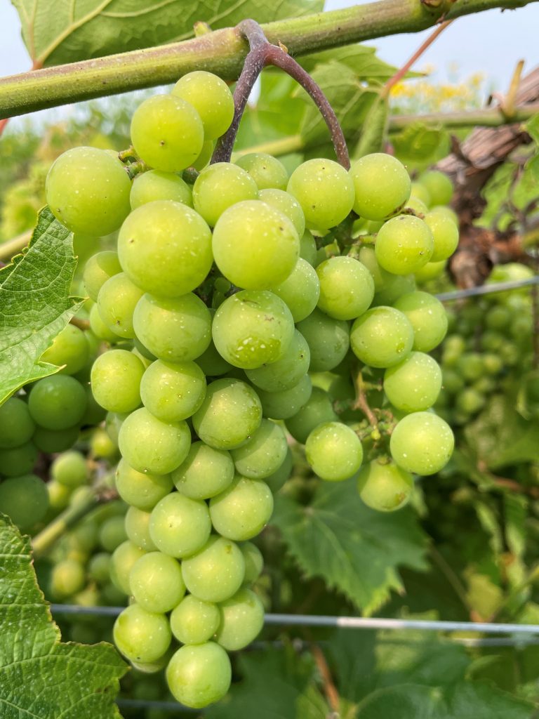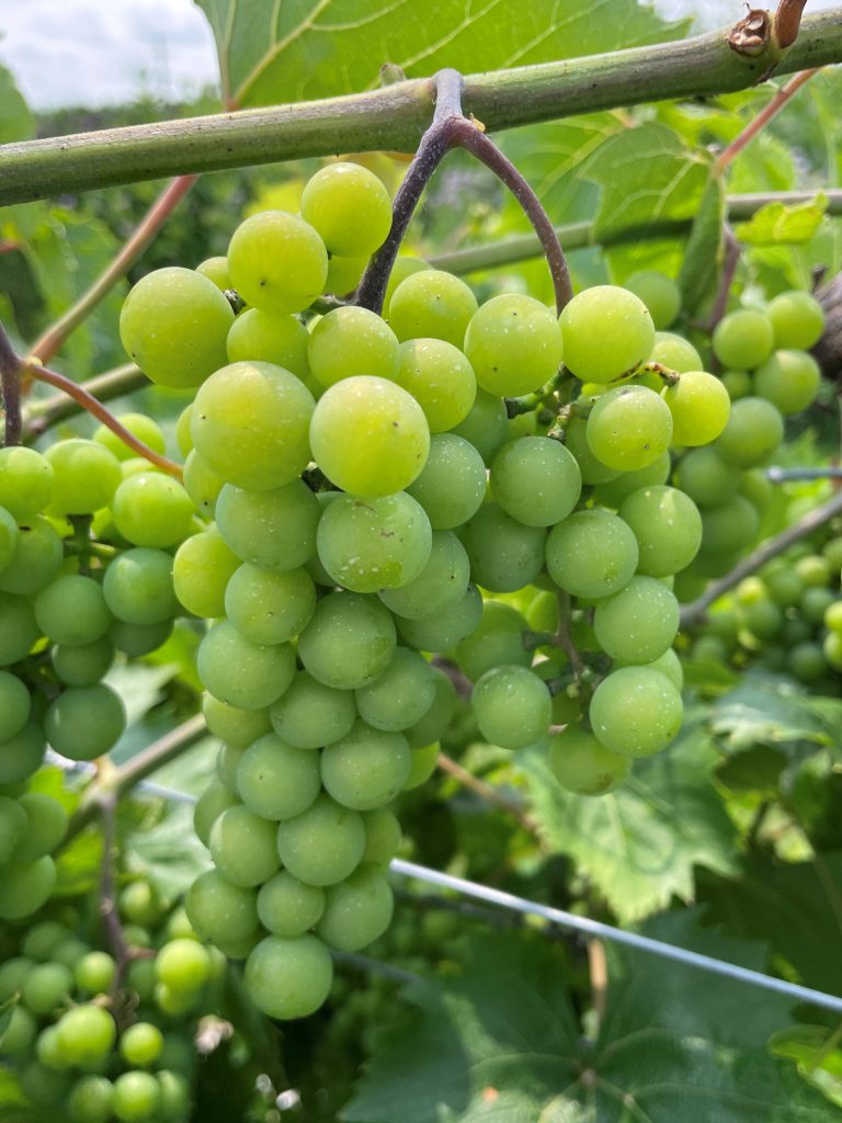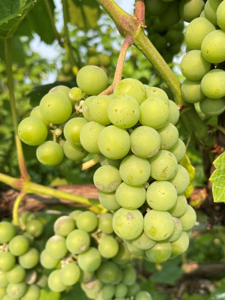 As of July 20 at the West Madison Agricultural Research Station (WMARS) in Verona, WI, the cultivar Itasca has reached veraison (E-L* Stage 35), meaning that the berries have begun to change color and softening continues. In a white grape cultivar like Itasca, the berries begin to change from green to a more golden hue. The berries of Marquette and some Frontenac clusters have begun to soften (E-L Stage 34), while those of Brianna, La Crescent, Petite Pearl, and Crimson Pearl are still hard and green (E-L Stage 33). One of the WMARS vineyards is experiencing a notable incidence of powdery mildew, evident in the pictures of Brianna and La Crescent below.