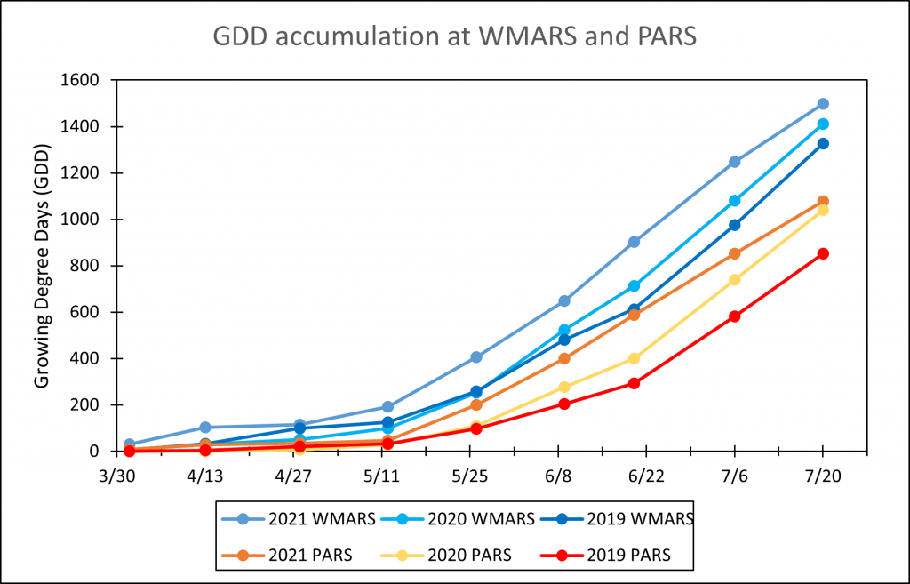 At both WMARS and PARS GDD accumulation slowed over the past two weeks, but the total accumulations are still greater this season than for either 2020 or 2019. The current GDD accumulation as of July 20 at PARS (1079 GDDs) is approximately three weeks behind that of WMARS.