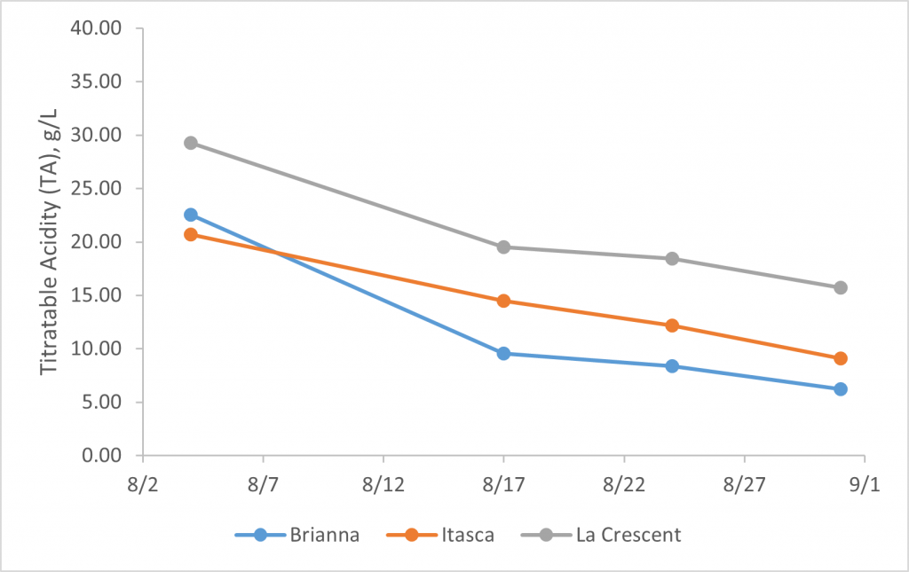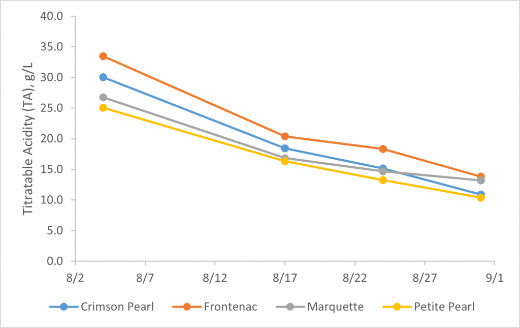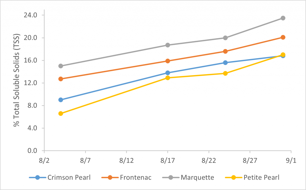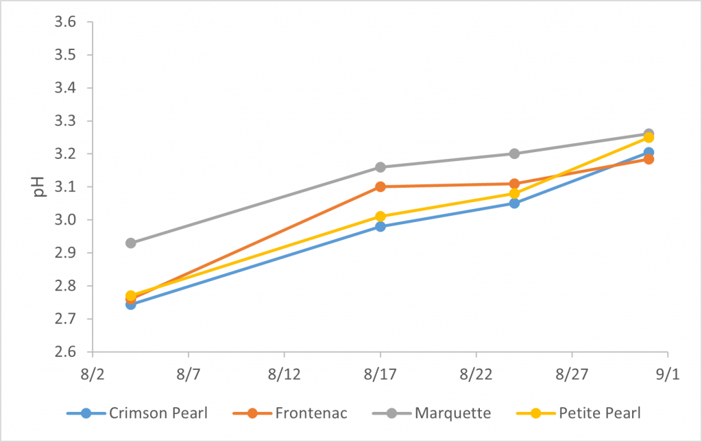 Below are graphs showing the progression of the berry ripening parameters at WMARS: % total soluble solids (TSS), titratable acidity (TA) concentrations, and pH. All cultivars reported here are grown on the high cordon training system.