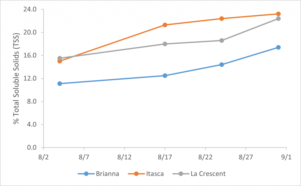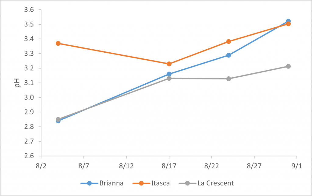 The berries of all cultivars at West Madison Research Station (WMARS) are either not quite ripe (E-L* Stage 37) or are harvest-ripe (stage 38). See Table 1 for veraison (beginning of berry color change) and harvest dates, as well as the final fruit quality parameter readings for each cultivar. This week (September 1) we harvested all of our white cultivars: Brianna, Itasca, and La Crescent. In many years, pollination of Brianna can be hampered by spring rains, but this year we had great fruit set. Although this cultivar also experienced significant levels of powdery mildew this year, clusters were full and tight. With its early high sugar levels (above 20.0 %TSS by mid-August), Itasca was very attractive to the birds unfortunately, reminding us that we will need to put the bird netting up sooner than we might think! This year we were able to harvest La Crescent before its characteristic shelling (dropping) of berries began in earnest. In addition, conditions this year allowed this cultivar to attain good sugar levels while dropping to a reasonable acidity.