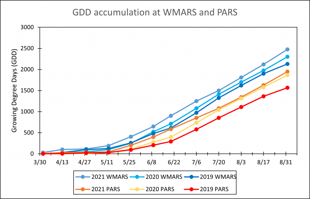 The rates of GDD accumulation at both WMARS and PARS for the later summer have continued the same trends as reported two weeks ago. This year’s season has the greatest GDD accumulation, while 2020 and 2019 had less, in that order. The differences between each of the years’ totals is similar to that of up to four weeks ago. At PARS, the current and 2020 season accumulations are nearly the same, while the 2019 season in mid August is the coolest of any year or location.
