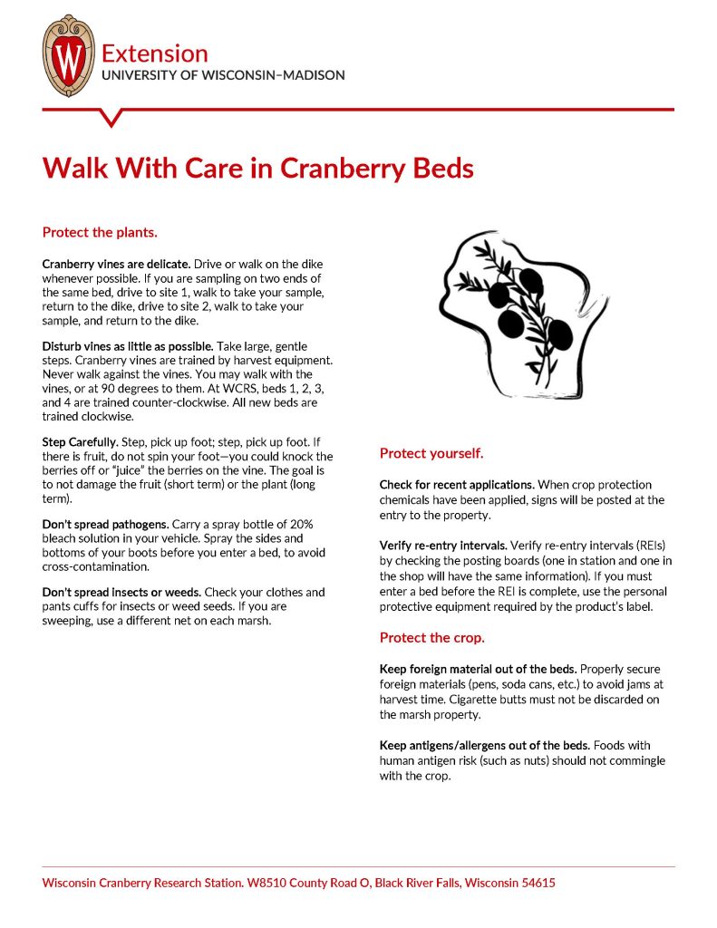 The Wisconsin Cranberry Research Station hosts tours for the media, public servants, local school groups as well as in-bed research conducted by UW-Madison staff and students. To help visitors protect the plants, themselves, and the cranberry crop during their visits, the Station Manager and the Wisconsin Cranberry Research and Education Foundation requested that I make a printable guide.