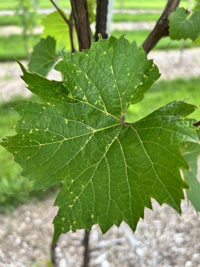 While walking through your vineyard, you might notice yellow spotting on leaves (Figure 1) and we’ve begun to see it in the vineyards at the West Madison Agricultural Research Station. This yellow spotting is commonly observed on newly expanding leaves. These yellow spots will develop a black spot in the center, a diagnostic symptom of Phomopsis leaf spot (Phomopsis viticola). Phomopsis cane and leaf spot is an early season disease. The pathogen overwinters in the vines, and sporulates and spreads with early season wetting events.