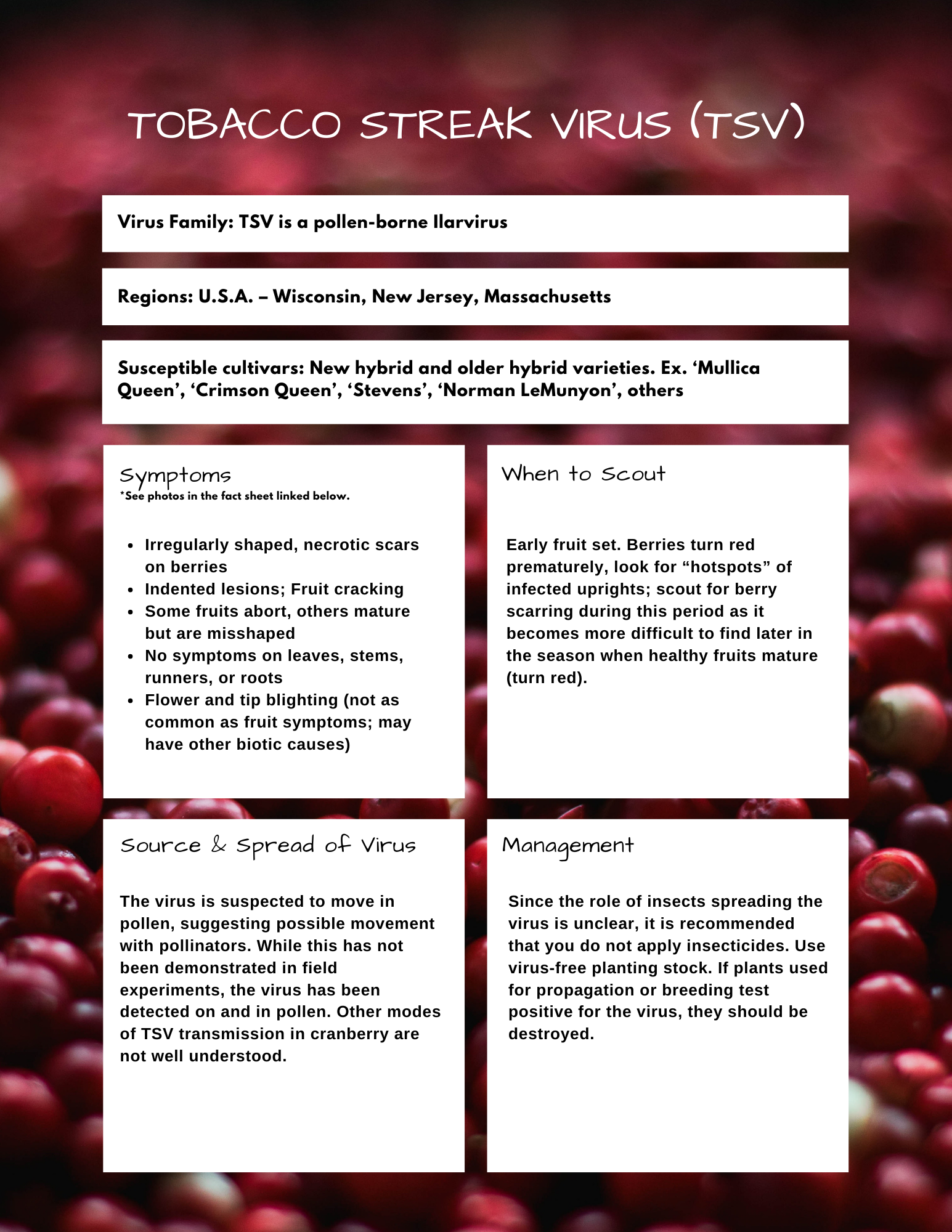 Wells-Hansen, LD and McManus, PS. 2016. Tobacco Streak Virus in Cranberry (A4110). UW-Extension, Cooperative Extension. https://cdn.shopify.com/s/files/1/0145/8808/4272/files/A4110.pdf