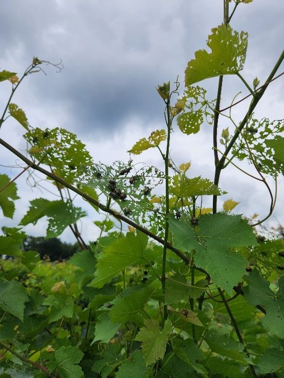The Japanese beetle (JB; Figure 1), an invasive insect pest that can cause economic damage to several fruit crops, started showing up in large numbers here in Wisconsin in the past 3-4 weeks. JBs feed on the leaves of over 300 plant species and can be difficult to manage due to their high mobility and dense numbers. Current control strategies focus heavily on insecticides, with many fruit growers making multiple spray applications to control this pest throughout the summer months. Insecticides should be used minimally, as applications pose risks to non-target insect species (Serrão et al. 2022), have environmental and social impacts, and can lead to resistance from insect species to insecticides (Forgash 1984). For growers hoping to reduce or avoid insecticide applications, there are a few other management strategies for Japanese beetle that should be considered.