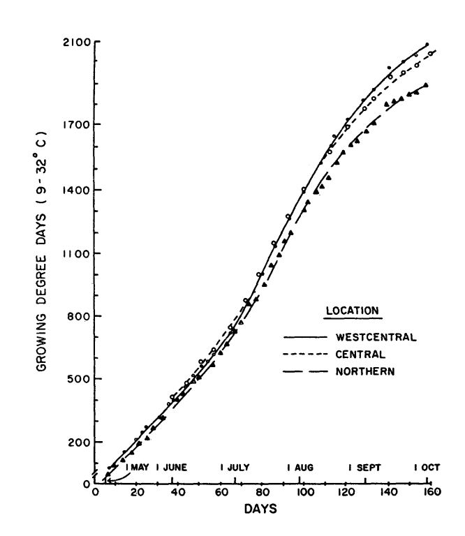 Figure 1 shows the progression of plant GDDs across the 1982 growing season in the three locations. In general, a trend exists that while northern latitudes accumulate GDDs more slowly early in the spring, the longer day length in mid summer allows sufficient accumulation for fruit production. This data set in particular does not show that trend dramatically, so I wanted to mention it so you can watch for it in other years.