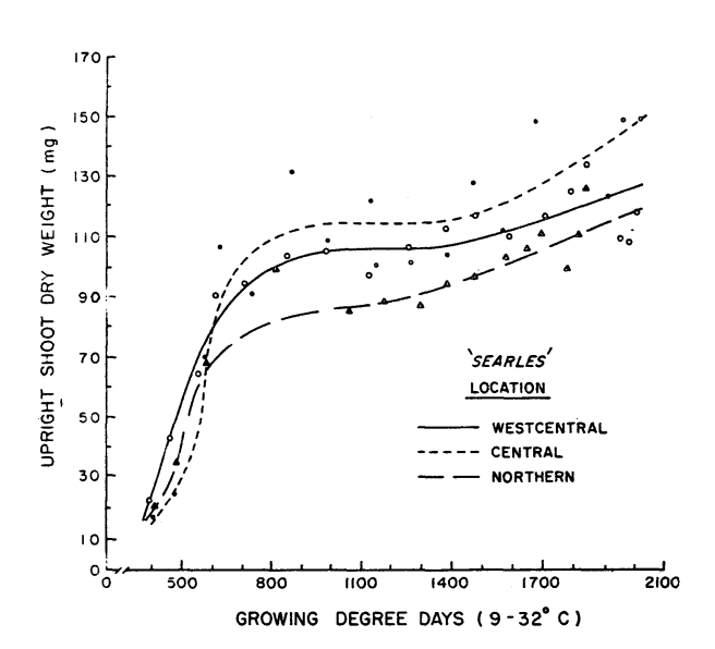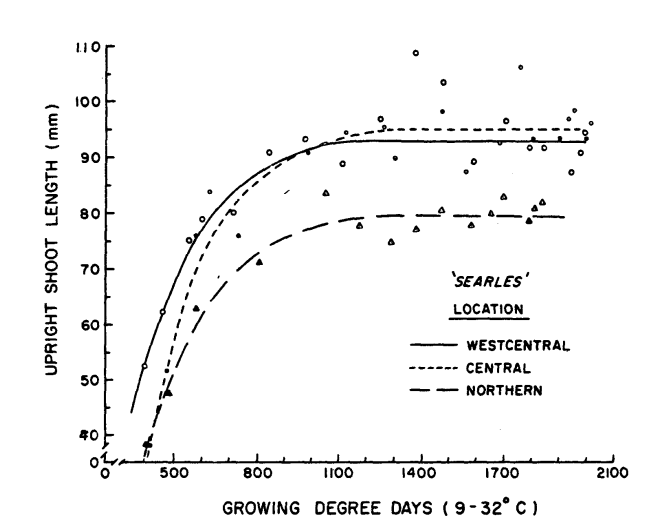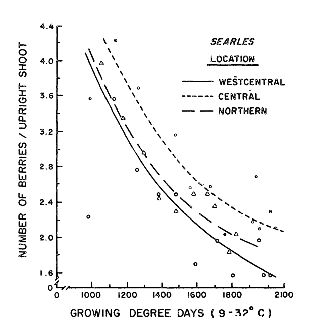 Growers from three locations provided Searles shoots and berries throughout the 1982 growing season. Two locations (central, westcentral) were at 44° latitude, and one (northern) was at 45° 30`.