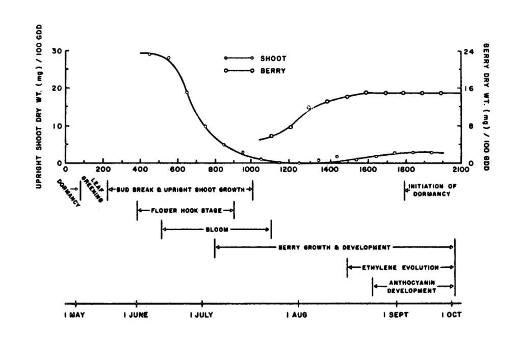 Stang and Hawker used a plant growing degree day (GDD) accumulation to chart shoot length, berry length, shoot weight, and berry weight. The plant GDD model they used calculated growing degree-days between 48.2° Fahrenheit and 89.6° Fahrenheit. They also tracked ethylene evolution and anthocyanin production, but did not find them to correlate with the chosen GDDs well.