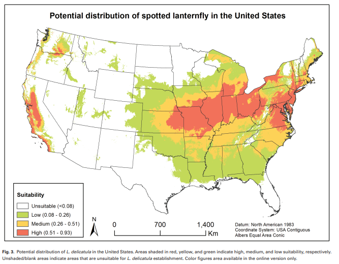 - Some more good news for cranberry growers: given the location of cranberry production in Wisconsin, overall SLF risk may be low. Based on the modeling study The Establishment Risk of Lycorma delicatula (Hemiptera: Fulgoridae) in the United States and Globally, central and northern Wisconsin were deemed to have low suitability for SLF or were unsuitable. Things could always change over time, but Wisconsin doesn’t appear to be great SLF habitat compared to other Midwestern states.