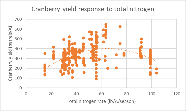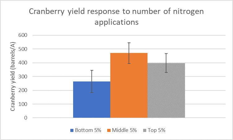 By far, the greatest influence on yield was the cranberry variety, where it’s common knowledge that the newer introductions far outyield older varieties. As for variables that can be managed by the grower, insecticide use had a strong positive effect on yield, suggesting heavy insect pressure in this particular season. Increasing the number of fertilizer split applications was also related to increased yield, more so than season total nitrogen rate. Each split in nitrogen fertilizer application was related to a 6.8 barrel per acre increase in yield. Interestingly, sanding year was also highly related to cranberry yield, where each year out from the most recent sanding decreased yield by about 5 barrels per acre.
