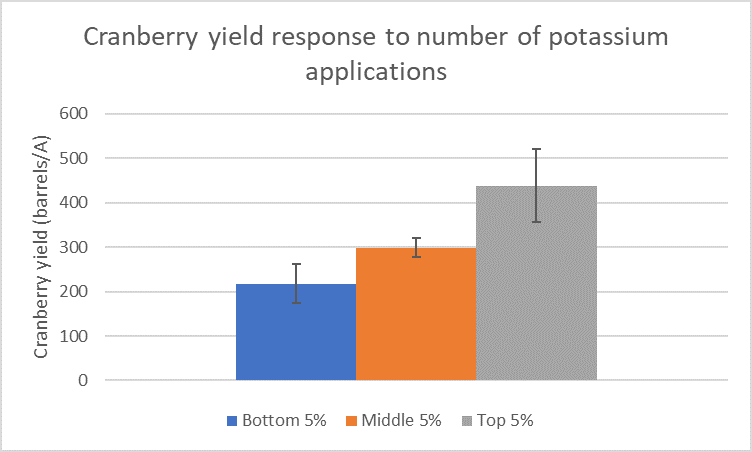 Is there a yield advantage to intense management and conversely a yield penalty to managing less intensely or using fewer inputs? Advances in agricultural practices, variety genetics and technology have driven substantial increases in crop yield and quality. But does it pay to be leading the pack in making changes on the marsh, is the “sweet spot” to be in the middle of the pack and is there a penalty to being the last to alter production? When it comes to inputs like fertilizer and pesticides, is “more” always better or is the optimum not always the maximum? From the researchers’ standpoint, the impact of our work is only as good as the industry adoption of it, but what drives behavioral change? Here, we explored those questions and relationships with a few key variables that were identified in the first question analysis as influential to cranberry yield. Let’s contrast nitrogen and potassium nutrient management as an example. We’ve long known that the maximum is not the optimum when it comes to nitrogen, and that’s very nicely demonstrated in this data set where in figure 1 we see a very typical response curve and the yield penalty when excessive nitrogen pushes cranberry vines toward vegetative instead of reproductive growth. When it comes to the number of nitrogen applications during the season, there appears to be a yield penalty when too few passes over the bed are made, but not a benefit beyond the middle of the pack to be the most intense adopter of split applications (figure 2). In contrast, when the number of potassium applications are considered, there’s quite a stark advantage to making more split applications (figure 3).