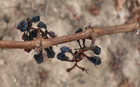Sanitation plays a critical role in managing this disease. Removing mummified fruit from trellises before bud break can significantly reduce the amount of inoculum present in the vineyard.