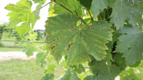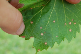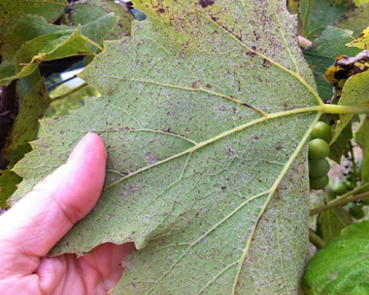 Initial symptoms are often first observed on suckers or lower canopy leaves which are close to the vineyard floor where downy mildew overwinters in leaves. Fruit typically becomes resistant to downy mildew approximately 3–4 weeks after bloom.