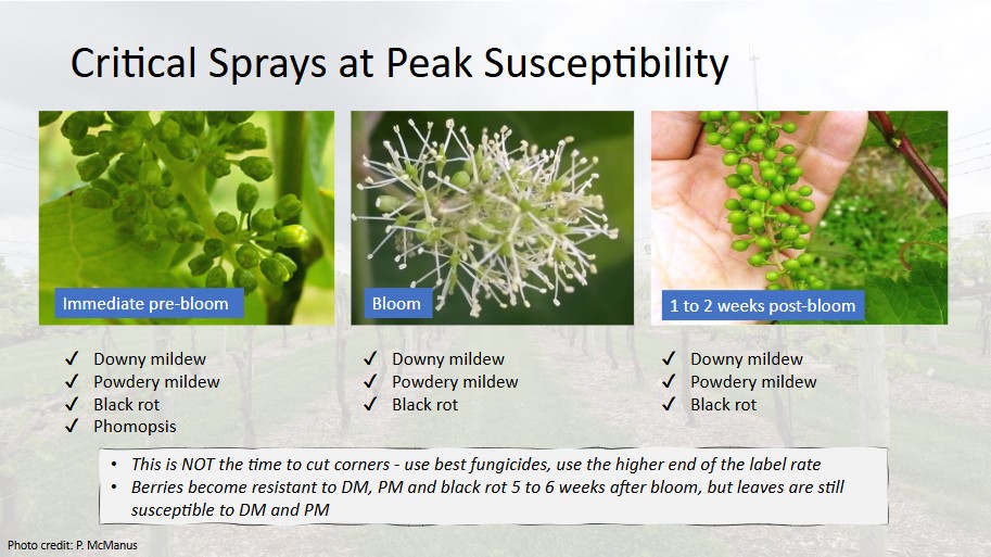 This window represents the peak susceptibility period to the pathogens associated with black rot, powdery mildew, and downy mildew. Because of this, growers should avoid cutting corners during this time and instead use the most effective fungicides at appropriate label rates.