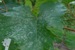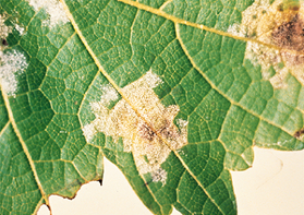 Powdery mildew leaf symptoms (left); powdery mildew cane lesions (right).