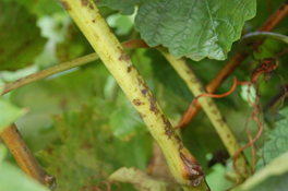Anthracnose is another disease that can cause problems during wet seasons, particularly on susceptible varieties such as Marquette. The pathogen overwinters on infected canes and spreads through splashing rain in the spring.